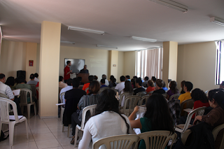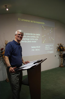 Taught "Genesis vs. Evolution" to about 40 seminary students. The students loved every minute even though we didn't have time to get into much of the scientific evidence. The class was split into two 4 hour sessions given Thursday and Friday evening. We were slowed because the teaching required interpreting from English to Spanish, and so we were unable to cover the last two sections on Cosmology and Geology. Sunday evening we invited the entire seminary class to the church where we completed the last two hours (picture below). The seminary did video the class, but we forgot to ask someone to take pictures for us so we have no photographs.
